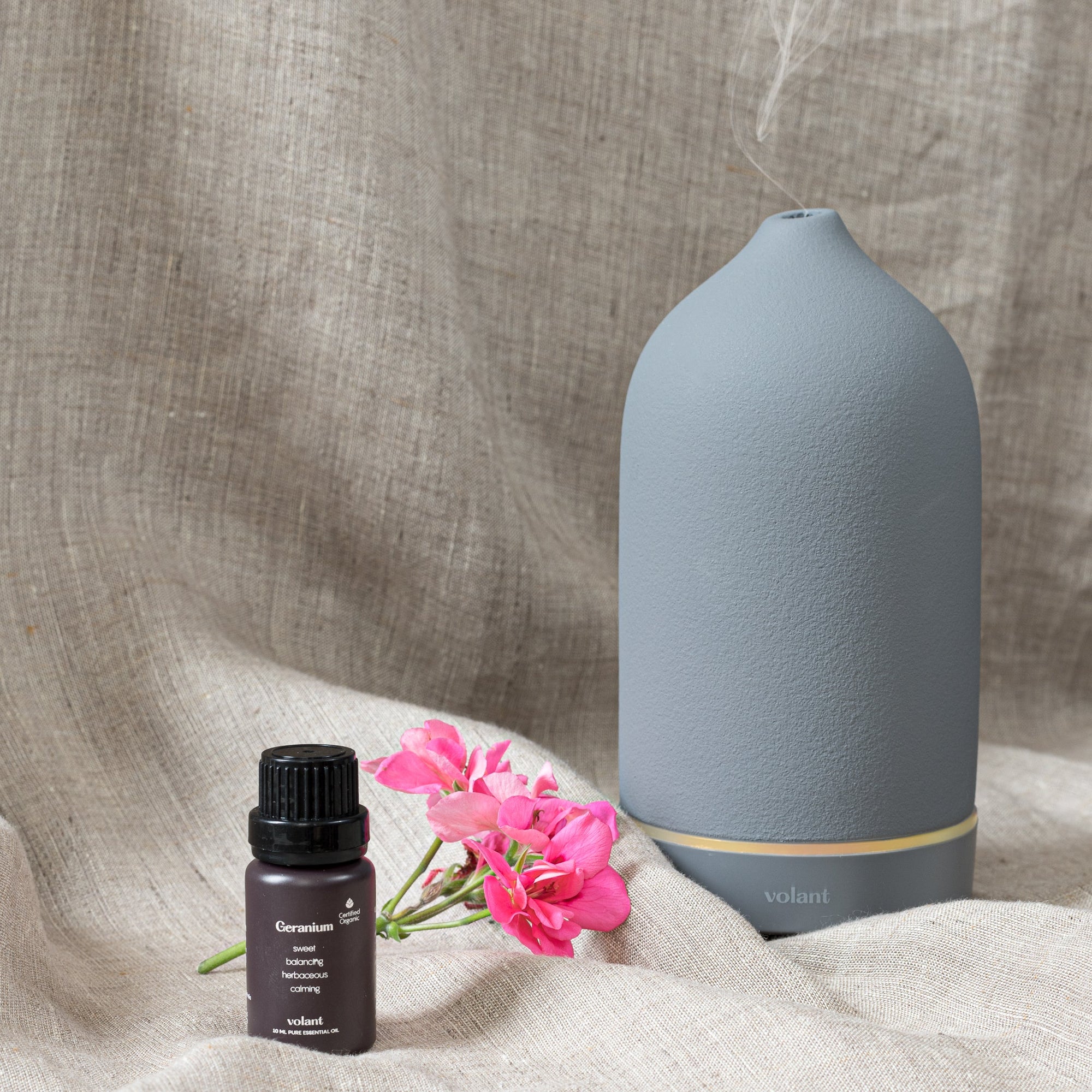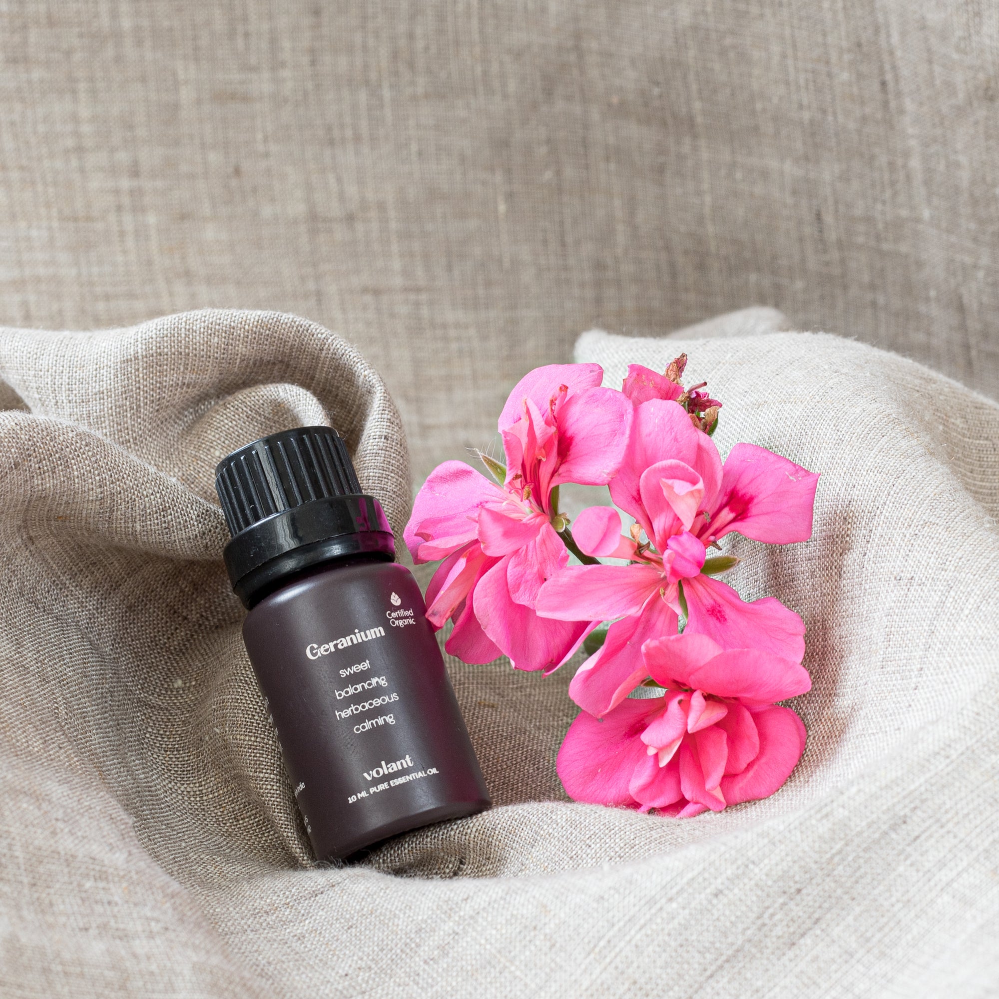 Volant Økologisk Geranium kjennetegnes av en sterk blomsterlig duft med en undertone av mint. Dens unike, dynamiske og balanserende tilnærming gjør den til en yndet ingrediens i hudpleieprodukter. På grunn av sin forsonende og myke tilstedeværelse er den perfekt i diffuseren etter en lang dag på jobb.
